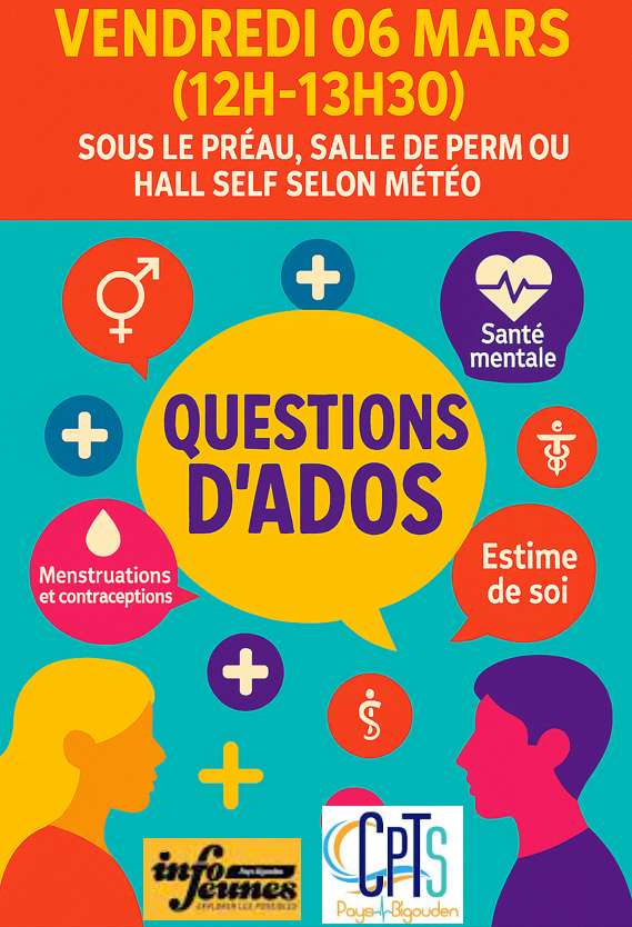 "Questions d'ados" C'est au cours d'une pause méridienne que tous les collégiens ont pu, selon leurs questionnements personnels du moment, venir à la rencontre de professionnels du territoire. Un programme à la carte, selon les besoins des collégiens : échanges, informations, prévention sur divers thèmes : estime...